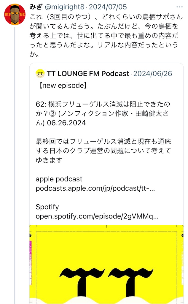 いつものようにTT Lounge FMを聴いていたところ、(それまでのエピソードの流れで)クラブ経営の難しさに話題がとんだ。数ヶ月前にサガン鳥栖のスポーツダイレクターから身を引いた(引かざるを得なかった)パンゾーさんの言葉には、一般論としての立場ではなく、自身が悩み苦しんできた背景がもたらす重みがあった。